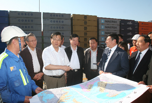 ????2009年5月26日,中共中央政治局委員、國(guó)務(wù)院副總理張德江在青島港考察。張德江肯定了青島港多年來(lái)所取得的成績(jī),并強(qiáng)調(diào)港口要大發(fā)展,關(guān)鍵要想方設(shè)法擴(kuò)大輻射面,擴(kuò)大貨源腹地。交通運(yùn)輸部部長(zhǎng)李盛霖,山東省委書(shū)記姜異康、省長(zhǎng)姜大明等陪同考察。