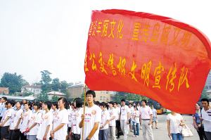 ?學(xué)生志愿者做微塵公交售報活動啟動,志愿者接旗。 記者 王建亮 實習(xí)生 孫亮 攝