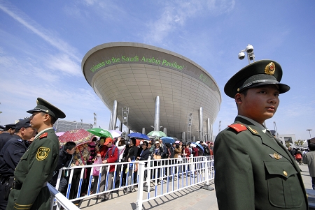 上海世博會昨平穩(wěn)通過40萬人“壓力大測試”。圖為沙特阿拉伯館外游客有序排隊。