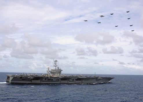 資料圖:華盛頓號(hào)航母及其空中護(hù)衛(wèi)編隊(duì)。