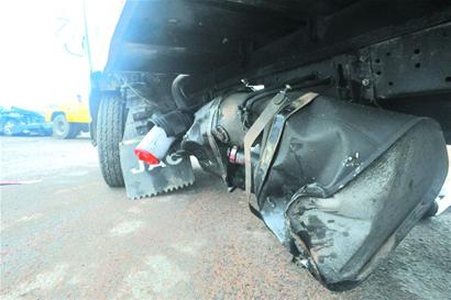 ????記者看到車(chē)禍現(xiàn)場(chǎng)西側(cè)是一片工地,路口交通信號(hào)燈一直黃燈閃爍示警,不時(shí)有車(chē)輛從工地方向駛出,從馬路中間隔離墩豁口橫過(guò)馬路。一輛白色的廂式貨車(chē)就橫在馬路中間的隔離墩豁口處,車(chē)身左側(cè)的油箱被撞破,一輛黑色比亞迪轎車(chē)車(chē)頭頂在廂式貨車(chē)車(chē)身中部,車(chē)前蓋蹺起,車(chē)頭被撞凹陷,駕駛室內(nèi)仍然能看到斑斑血跡,車(chē)內(nèi)傷者已經(jīng)被120救護(hù)車(chē)緊急送往海慈醫(yī)院急救。交警隨后趕到現(xiàn)場(chǎng),將兩輛肇事車(chē)拖走。