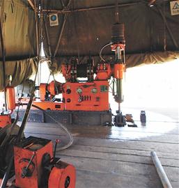 ????帳篷內(nèi),最吸引記者的,就是里面正在作業(yè)的鉆井機器了,機器飛轉,四周迸射出一些水花,一名身穿綠色軍裝的戰(zhàn)士正在邊上不時查看操作著。他告訴記者,機器正在鉆井,取上地下的巖石進行分析,看看含金量如何,查找金礦。