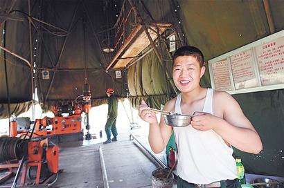 ????從北泊村里穿過去向東走,步行十分鐘,繞到山這邊,兩個“綠塔”遠遠地出現(xiàn)在了記者面前。“綠塔”高約二十多米,兩“塔”相隔十多米。走上前去,發(fā)現(xiàn)“塔”之所以呈綠色,是因為上面蒙著綠色的帆布,像一個巨大的帳篷。大帳篷里面,有四五個戰(zhàn)士,由于天氣炎熱,多數(shù)穿著背心。他們正在吃午飯,看到記者走過來,一名靠近帳篷口的戰(zhàn)士端著飯盒,有點警惕地問“有什么事? ”記者表明來意后,這名戰(zhàn)士又透出一股熱情。