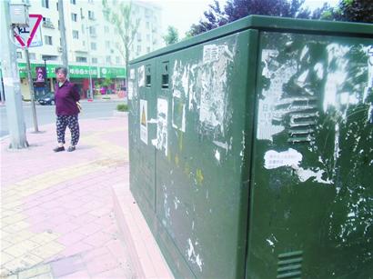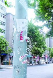 ????以記者昨日觀察的沈陽路為例,路旁的電線桿、路燈桿、交通設(shè)施干等等,可以說除了很難貼上紙的樹干外,全部張貼著小廣告。雖然能看到有人多次清理的痕跡,可清理之后仍然有人來張貼,使得電線桿上“癬”影重重。其中無論路邊的配電箱和通訊轉(zhuǎn)換箱,更是成了小廣告張貼的重點區(qū)域。