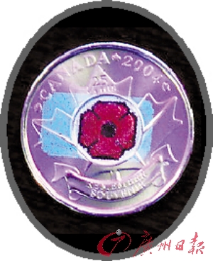 2007年,一群美國軍火商在加拿大租車時,車中發(fā)現(xiàn)了一種設計奇特的面值25分硬幣,其中一面圖案是楓葉上鑲嵌著紅色的罌粟花。
