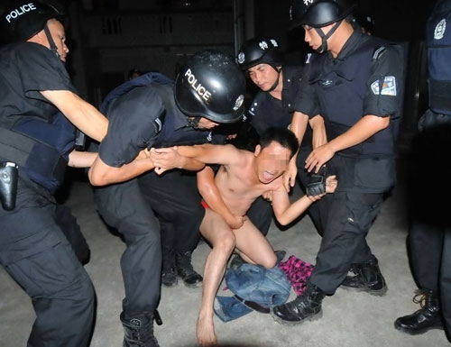 2010年7月8日凌晨,廣西南寧380多警力在橫縣一舉搗毀了一個(gè)以閉毓寧、閉廷醒等人為首的涉黑涉惡犯罪團(tuán)伙;圖為“老大”閉毓寧在被押到樓底時(shí)候掙扎,很不配合,期間民警給他穿衣服他一再拒絕