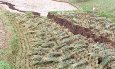 ????7月25日凌晨,湖南省雙峰縣杏子鋪鎮(zhèn)虎塘村發(fā)生大面積沉陷,全村近兩平方公里范圍內(nèi),不少房屋、公路、水塘、稻田出現(xiàn)沉陷或開(kāi)裂,房屋裂縫最寬達(dá)20余公分,稻田最大裂縫寬度則超過(guò)了一米,倒塌房屋兩間。所幸沒(méi)有造成人員傷亡。
