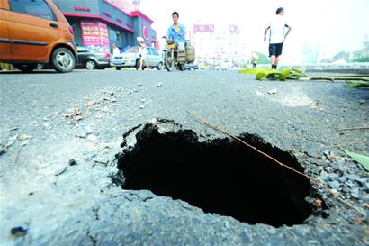 ????記者走上前去觀察,發(fā)現(xiàn)這個洞長約20厘米寬約15厘米,距離這個坑洞一米遠(yuǎn)處就是一個雨水古力,而順著洞口望下去,這個洞深約2米,視力所及范圍內(nèi),約五六平方米的地方已經(jīng)懸空,磚頭砌成的雨水井壁也已坍塌,連接的水管早已斷裂破爛掉。而坑洞附近地面只有一層瀝青面支撐著,壓力稍大隨時有塌陷的可能。市民張先生告訴記者,這個坑前天就出現(xiàn)了,只不過很小,很多人沒有注意,而隨著來往車輛的碾壓,這個坑越來越大,他發(fā)現(xiàn)下方已經(jīng)抽空了,如果有大型車輛經(jīng)過準(zhǔn)會被軋塌,車子陷進(jìn)去就麻煩了。