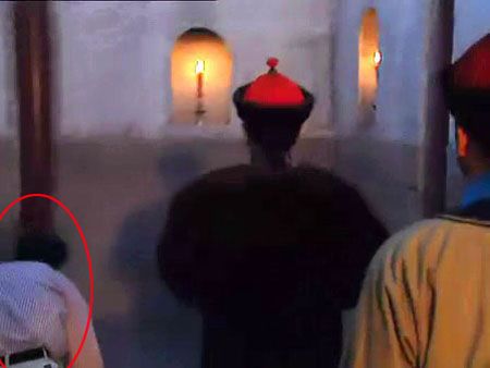 ????在《雍正王朝》第二十集,胤禛被張五哥引領(lǐng),去康熙皇榻前領(lǐng)旨繼位,在游廊中,穿黃馬褂的侍衛(wèi),給胤禛搜身之后,胤禛脫去大氅繼續(xù)往前走。此時(shí),一個(gè)穿著短袖白色襯衣,好像還扎著腰帶的不知道是燈光還是攝影的工作人員,貓著腰從胤禛左手側(cè)穿過(guò),持續(xù)時(shí)間有好幾秒鐘。