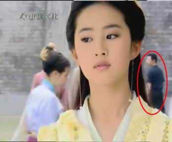 仙劍奇?zhèn)b傳》第二十集,背景出現(xiàn)了一個(gè)穿短袖的現(xiàn)代黑衣男子在街邊看風(fēng)景。
