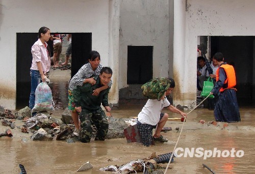8月14日,“5.12”震中四川汶川遭遇泥石流災(zāi)害,導(dǎo)致38人失蹤。圖為救援官兵在映秀鎮(zhèn)轉(zhuǎn)移受困群眾。 中新社發(fā) 沈消軒 攝
