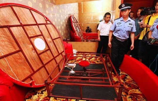 ????8月13日晚,記者跟隨公安雁塔分局民警來(lái)到位于東儀路南段的“紫荊城水療城”,整個(gè)屋內(nèi)就像迷宮一樣,每個(gè)房間的門上都安裝有門鎖,且門上都沒(méi)有透視窗。檢查過(guò)程中,民警發(fā)現(xiàn)兩個(gè)房間內(nèi)的床呈圓形,看上去就像碾盤一樣。床下的地面上安裝有一個(gè)遙控控制的電機(jī),電機(jī)啟動(dòng)后,這個(gè)床呈360度旋轉(zhuǎn),并且根據(jù)不同的頻率升降。一位民警說(shuō),“這是公共休閑娛樂(lè)場(chǎng)所明令禁止的涉嫌色情服務(wù)的‘性愛(ài)合歡床’,是絕對(duì)不允許存在的?!?/p>
