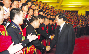 ????2005年8月25日,顧瑛代表南通市公安局刑警支隊赴京受獎,受到黨和國家領導人的親切接見。圖為胡錦濤總書記親切地握著顧瑛的手。本報資料圖片