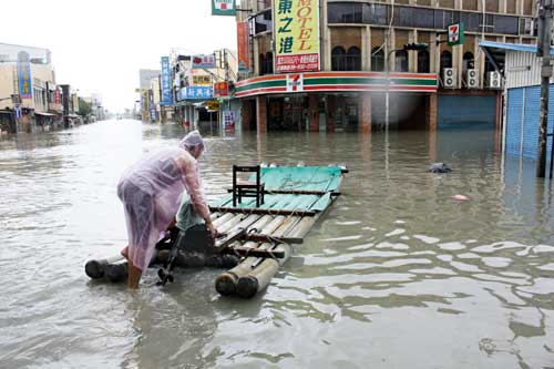 屏東縣林邊鄉(xiāng)積水,四處一片汪洋,鄉(xiāng)民找來竹筏進(jìn)出。 來源:臺灣《聯(lián)合報》