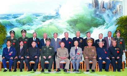????金正日(左五)、金正恩(左三)、中共中央軍委副主席郭伯雄(左四)與中國志愿軍老戰(zhàn)士代表團成員合影。