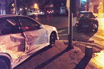 ????三菱轎車司機(jī)驚魂未定站在車旁跟朋友商量著?!拔耶?dāng)時看到前面是黃燈,還以為要轉(zhuǎn)成綠燈,這才開過去,誰想到這輛越野車從側(cè)面沖出,撞在我的車身右側(cè)?!比廪I車轉(zhuǎn)90度,來了個特技漂移,沖上了路邊的人行道,還把垃圾箱給刮倒了。而越野車司機(jī)姜先生稱,他本來打算送車上兩名女士回家,當(dāng)時路口是綠燈,沒想到這輛三菱轎車突然沖出,他剎車不及撞了上去。交警部門正在調(diào)查此事。 (黃飛 于滈 徐棟 攝影報道)