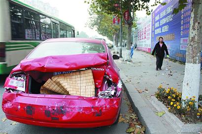 ????記者趕到事故現(xiàn)場時,交警剛剛將路中間的事故車疏導(dǎo)到路邊,而體型較大的卡車因為車損較輕已經(jīng)獨立駛離了現(xiàn)場,但是被它撞傷的車依次停在路邊,只見一輛紅色的私家車車后燈被撞碎,后廂已經(jīng)完全變形,車后蓋被撞成了 “麻花狀”。“我當(dāng)時正停在路口等紅燈,突然間轟的一聲后邊的車撞上了我的車,我趕緊拉手剎,結(jié)果隨后又是兩次撞擊,巨大的慣性讓我的車頂上了前面的車輛。”紅色車的車主說。
