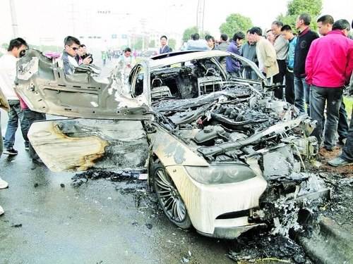 ????距離保時(shí)捷大約100米的白色寶馬車更是慘不忍睹。整個(gè)車子被燒得面目全非,座位、方向盤、儀表盤等也全部燒光,只剩下車架。