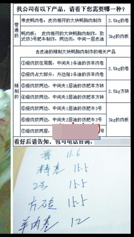 ????“這就是我們的產(chǎn)品,除了一卷是羊肉外,其他的都是鴨肉?!崩钕壬f著,又向記者介紹哪種比較好,哪種稍微差。“最普通的鴨肉每斤賣5塊多,切成羊肉片能賣十幾元?!?/p>