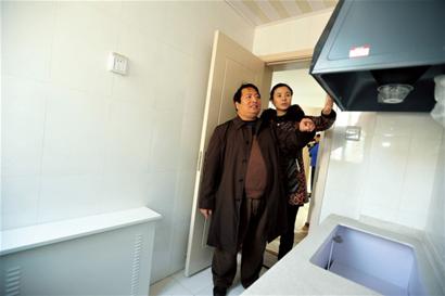 ????47歲的項本勝和妻子走進9號樓一套三居室戶型,近50平方米的房間已經(jīng)完成精裝修,廚房、衛(wèi)生間地面和墻上都鋪好了瓷磚,客廳臥室地面鋪有復(fù)合地板?!斑@些灶具別的房子都有吧。”看到廚房中的一體櫥柜、打火灶、吸排油煙機,項本勝有點不相信廉租房會有這么齊全的設(shè)施,在得到工作人員的肯定回答后,兩口子樂得合不攏嘴。