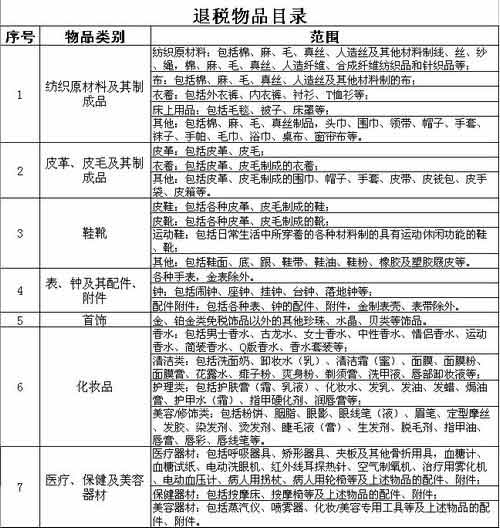 ????(四)退稅物品。退稅物品是指國家允許攜帶出境并享受退稅政策的個人生活物品,但食品、飲料、水果、煙、酒、汽車、摩托車等不包括在內(nèi)。退稅物品目錄詳見附件。