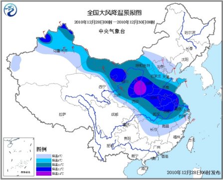 ????中新網(wǎng)12月28日電 中央氣象臺(tái)28日清晨發(fā)布寒潮藍(lán)色預(yù)警,預(yù)計(jì),12月28日8時(shí)至30日8時(shí),新疆西部和北部、甘肅大部、寧夏、陜西、內(nèi)蒙古中西部、華北、黃淮、江淮、江漢、重慶北部、江南中北部等地將出現(xiàn)6~10℃降溫,其中,新疆北部、內(nèi)蒙古西部、寧夏北部、陜西中北部、山西中南部、山東南部、河南北部和東部、安徽中北部、江蘇中西部等地的部分地區(qū)降溫幅度可達(dá)12~14℃;上述大部地區(qū)有4~6級(jí)偏北風(fēng)。