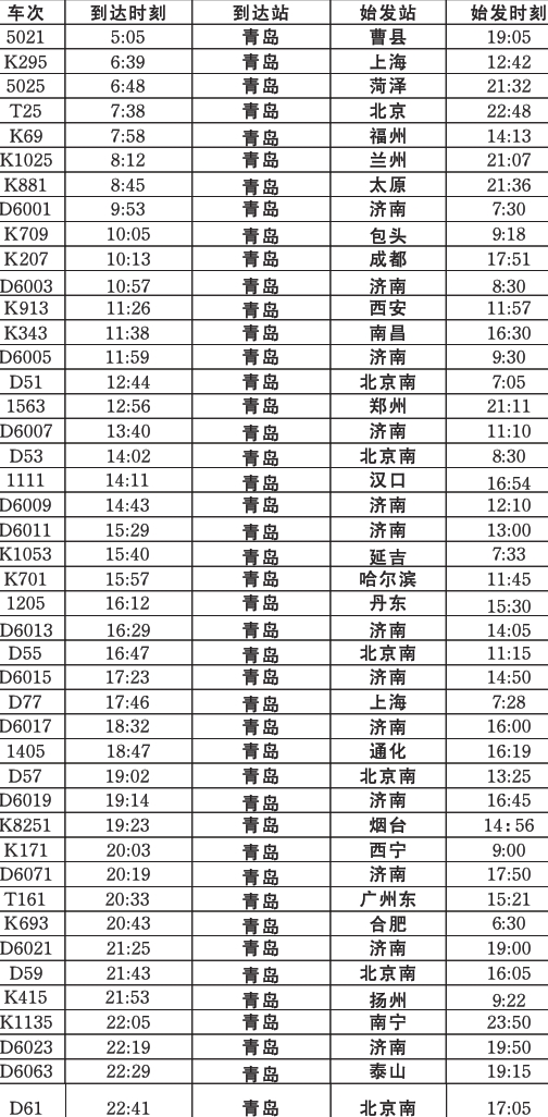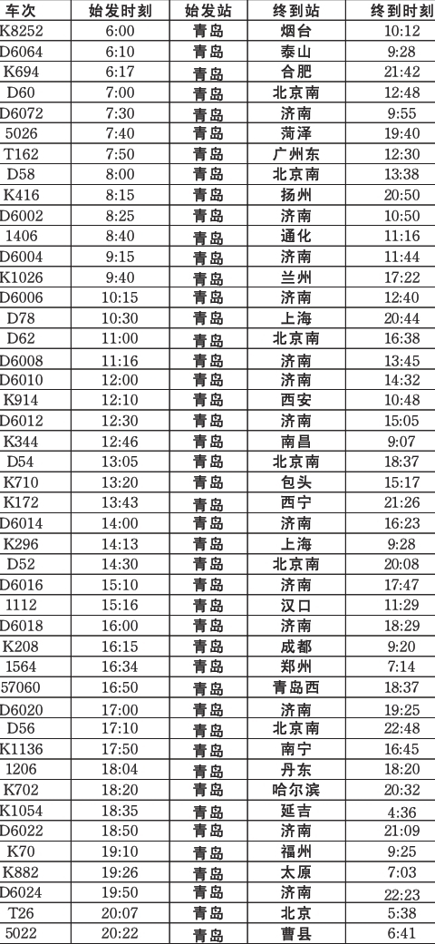 ??? 1月11日零時起,全國鐵路開始實施新的列車運(yùn)行圖。記者1月1日采訪了解到,濟(jì)南鐵路局在此之前公布了新的鐵路運(yùn)行圖調(diào)整公告,根據(jù)公告,1月11日新的鐵路運(yùn)行圖調(diào)整后,進(jìn)出青島的29趟列車停站情況有變,而且膠州北站將正式啟用,四趟列車在此停站。同時1月2日,青島火車站公布了新的列車時刻運(yùn)行表,自1月11日起開始執(zhí)行,有出行打算的市民可要看好了。