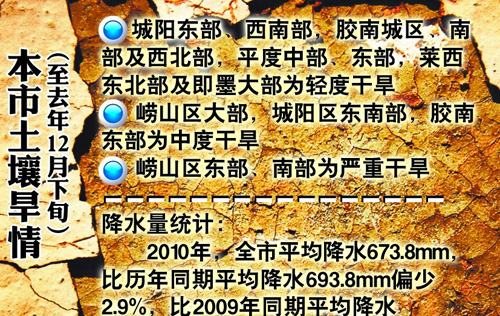 ????4日市水文局發(fā)布了2010年降水、蓄水、旱情的總體情況?!?0月份以來,全市降水量異常偏少,出現(xiàn)了歷史罕見的旱情?!惫ぷ魅藛T告訴記者。2010年10月1日至12月31日,全市平均降水僅 9.1mm ,比歷年同期偏少86.9% ,黃島、城陽、即墨、膠州、膠南都偏少90%以上,是有水文資料記載以來第2少的年份,僅高于 1969年的5.7mm 。到目前為止,全市平均已有89天無有效降雨,黃島、城陽、即墨、膠州、膠南連續(xù)無有效降雨天數(shù)已超過100天。