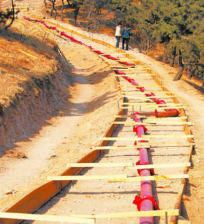 ????據(jù)了解,浮山山脈的平均坡度為45度,但這一段長約數(shù)百米的山路相當陡峭,個別險要段坡度接近60度。山路上剛剛鋪設了直徑約20厘米的管道,一直通到半山腰上的山勢平緩處。