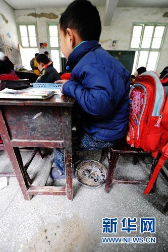 1月6日,湖南新晃縣茶坪學(xué)校的孩子們將火爐置于座位下讀書。龍弘濤攝