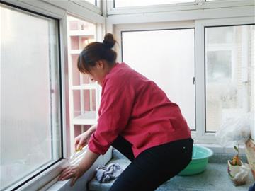 ????“我們干活一般是先擦窗,再打掃衛(wèi)生,打掃衛(wèi)生要先上后下,先里后外?!边@是一處南北朝向的大套二居室,面積大約100平方米左右,王大姐先到廚房,將里面的紙箱等雜物搬出來,騰出地方后,卸下窗戶上的紗窗,交給同伴去清洗。由于天氣過于寒冷,窗戶被凍住了一時打不開,王大姐拿出早就準(zhǔn)備好的螺絲刀,朝窗戶框下端的凹槽刮了幾下之后,稍一用力窗戶就松動了。做好這些準(zhǔn)備工作,王大姐拿出自己帶的雙面擦玻璃器,開始擦廚房玻璃,十幾分鐘之后,原本臟兮兮的窗戶就變得干凈了,此時同伴也洗好了紗窗,兩人一起把紗窗裝上,這部分算是“完工”了。