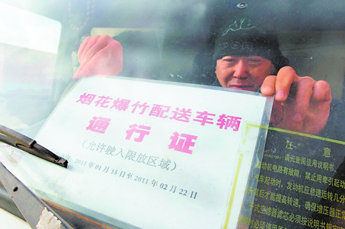 ????6時30分,車隊出發(fā)前往城陽郊區(qū)的倉庫。車輛在醒目位置懸掛“煙花爆竹配送車輛通行證”,證件上面明確標(biāo)注著車輛牌號、承運企業(yè)名稱、煙花爆竹批發(fā)企業(yè)名稱、運輸區(qū)域。