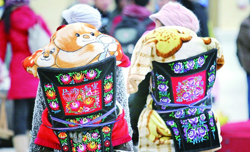 ??兩名少數(shù)民族婦女的行囊里背著可愛的寶寶。