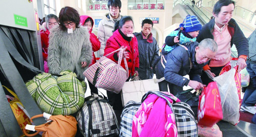 ????1月18日上午9時(shí),本市2011年春運(yùn)啟動(dòng)儀式在青島機(jī)場(chǎng)舉行,跟1月19日將要開始的全國(guó)春運(yùn)相比,青島的春運(yùn)提前了一天。據(jù)了解,春運(yùn)首日島城就進(jìn)入了客流高峰期,這股客流高峰預(yù)計(jì)將持續(xù)到2月2日(大年三十)。記者了解到,目前青島去往東北和西北方向的火車票持續(xù)緊張,而從青島出發(fā)的長(zhǎng)途車票也開始緊張起來(lái),不少方向開始出現(xiàn)加班車,有出行打算的市民最好提前購(gòu)票。