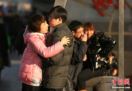 ????1月31日,兩對情侶在北京西站等候上車。據(jù)悉,春運前11天,中國道路客運量達(dá)到7.61億人次,同比增長13%。中新社記者 蘇丹 攝
