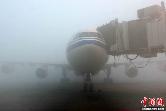 ????2月1日晨,一場大霧突襲成都平原,能見度最低時不足50米。成都雙流國際機場因大霧被迫關閉,造成大面積航班延誤或中途返航及備降其它機場,大量旅客被迫滯留機場。時值春運期間,這場大霧給雙流機場的客貨運輸帶來了極大的壓力。(中新社發(fā) 呂俊明 攝)