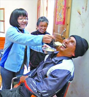 丘芹英是梅縣石扇鎮(zhèn)巴莊村三棟自然村一位有3個孩子的母親。40多年來,她丈夫長年體弱多病無法干重活,3個兒子一出生便相繼患怪病而癱瘓,面對苦難的家庭,今年已經(jīng)66歲的丘芹英用客家女性的勤勞、堅強、善良詮釋偉大、仁慈無私的母愛,硬是靠肩扛、用手抱將3個癱瘓兒子撫養(yǎng)成人,用她無私的母愛和客家婦女的善良與堅強,苦苦支撐著這個苦難的家庭走過了風風雨雨。2007年11月21日,本報A24版以《慈母背癱兒走過40年》為題報道了丘芹英一家的不幸和丘芹英無私博大的母愛后,感動了包括何方等驢友們在內(nèi)的許許多多讀者。從那時開始,每年春節(jié)和丘芹英一家人一起吃個年飯送慰問品成了梅州驢友們春節(jié)前最重要的活動之一,今年已是第4個春節(jié)。