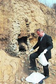 ????“我在大沽河河道里發(fā)現(xiàn)了一個‘古墓’,為了保護它不受破壞,請你們趕緊過來看看。”昨天上午,膠州膠萊鎮(zhèn)南王疃村村民王先生告訴記者,因家里地面出現(xiàn)了幾條裂縫,他準(zhǔn)備用沙和水泥將裂縫堵死。于是,2月8日上午,他拿著鐵锨來到村東側(cè)大沽河河道里取沙。就在他準(zhǔn)備離開時發(fā)現(xiàn),在河道一段土坡上露出了一些黑磚,他用鐵鍬鏟了幾下,眼前景象讓他驚訝不已,松動的泥土坍塌后,露出了一個磚砌的“古墓”,在“古墓”里他還找到了三個破碎的瓦罐。拿著瓦罐殘片,他找到村內(nèi)一些老人,但老人均不知道“古墓”的來歷。他便立即與記者取得了聯(lián)系。