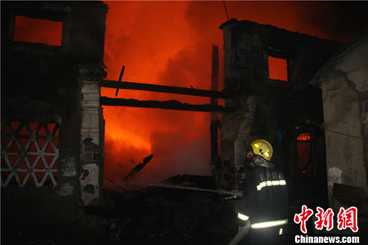 14日23點52分,三門消防大隊接到報警稱,在縣城關發(fā)生大火,火勢很大。三門消防立即出動4車28人于十分鐘左右趕到現(xiàn)場。到現(xiàn)場后,木架結構的二層老民房在大火中猛烈燃燒,紅彤彤的火光照亮了半邊天,現(xiàn)場還不時發(fā)出“啪啪”的聲音。