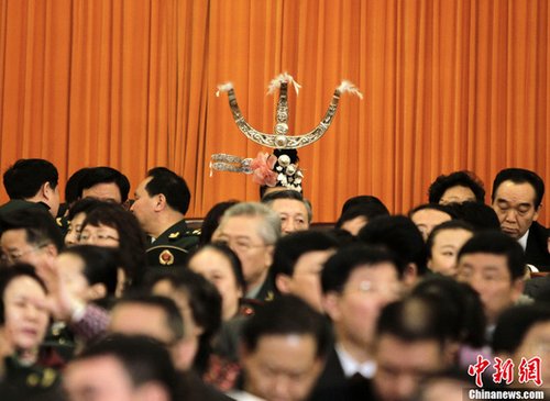 3月4日,十一屆全國人大四次會議預備會在北京人民大會堂舉行,一位少數民族代表的裝飾“脫穎而出”。 中新社發(fā) 盛佳鵬攝
