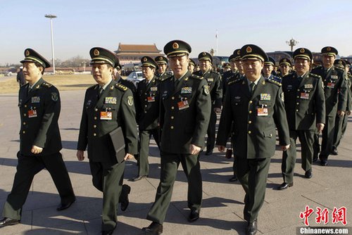 3月4日,十一屆全國人大四次會議預備會在北京人民大會堂舉行,解放軍代表團步入會場。中新社發(fā) 盛佳鵬 攝