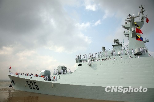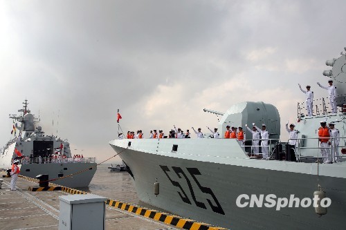 資料圖:2009年10月30日上午,中國(guó)海軍“馬鞍山”號(hào)、“溫州”號(hào)兩艘新型導(dǎo)彈護(hù)衛(wèi)艦從浙江舟山東海艦隊(duì)某軍港解纜啟航,遠(yuǎn)赴亞丁灣、索馬里海域執(zhí)行護(hù)航任務(wù)。中新社發(fā) 孫自法 攝