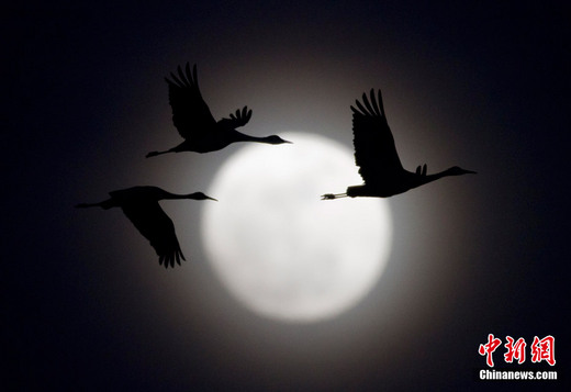 2011年3月18日,美國(guó)內(nèi)布拉斯加州,沙丘鶴飛過升起的月亮。美國(guó)航空航天局發(fā)布消息說,19日,月球?qū)⒌竭_(dá)19年來距離地球最近位置,它與地球的距離僅有35萬多公里,從地球上觀看,月球比遠(yuǎn)地點(diǎn)時(shí)面積增大14%,亮度增加30%,號(hào)稱“超級(jí)月亮”。