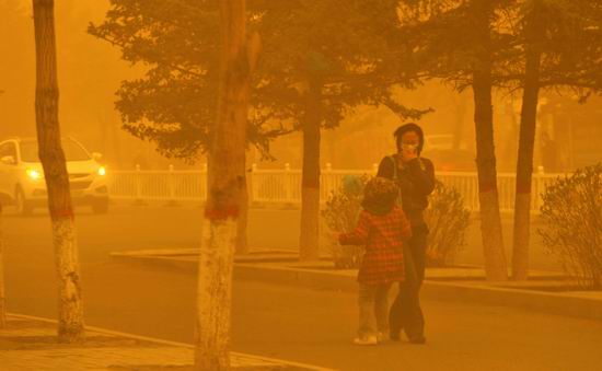 5月11日,受蒙古氣旋影響,內(nèi)蒙古錫林郭勒草原出現(xiàn)大風(fēng)強(qiáng)沙塵暴,錫林浩特市區(qū)昏黃一片,能見度很低,氣溫隨之下降8攝氏度左右。圖為一對母女在風(fēng)沙中走過錫林浩特市街頭。