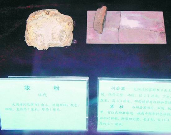 ????王館長還介紹說,在大鬧埠考古發(fā)掘中,他們還發(fā)掘出了化妝粉、研磨器和黛板,這是一套化妝用品,通常女子將化妝粉倒在黛板上,然后用研磨器在黛板上磨,化妝粉磨細(xì)后就可以涂抹在面部上了,這一套化妝品和大量銅鏡的出土,可以反映出西漢時(shí)期的女子非常愛美容也愛化妝。