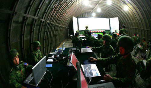 資料圖:解放軍已經(jīng)建成第一個網(wǎng)絡戰(zhàn)基地,這是其在信息化戰(zhàn)爭時代加強軍隊數(shù)字安全努力的一部分。官方稱之為信息保障基地。圖為解放軍聯(lián)合演習導演指揮部。