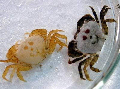 ????日本鳥羽市水族館一只殼上長有人臉圖紋的螃蟹(右)趴在它剛剛蛻下的殼邊。這只奇特的螃蟹是一名八歲男孩在海邊捉到后交給水族館的。