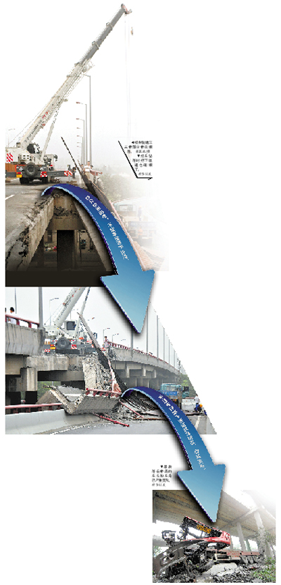 昨天凌晨2時許,連接杭州老城區(qū)與濱江區(qū)、蕭山區(qū)、蕭山國際機場的過江要道錢塘江三橋發(fā)生坍塌事故,其輔橋主橋面右側(cè)車道部分橋面塌落,一輛重型半掛車為避讓橋體裂縫墜落,又將下閘道砸塌。司機跳車受傷送醫(yī)。杭州市交通局昨日召開的新聞發(fā)布會稱,事發(fā)時半掛車載重超過100噸,涉嫌嚴重超載。