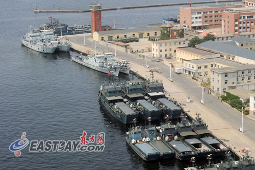 原文配圖:停靠在瓦良格號旁整修的眾多軍用艦船主要包括來自北海艦隊的2艘大型反潛護衛(wèi)艇以及多艘補給艦艇,還有最受關(guān)注的海軍88號訓練艦。