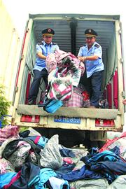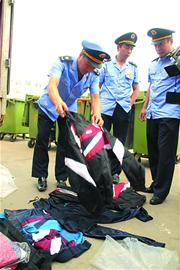 到達(dá)新天地后,工商工作人員將一包包假冒衣服扔進(jìn)廢物運(yùn)輸箱,工商局工作人員拿起一件黑紅白相間假阿迪達(dá)斯衣服告訴記者:“你看這件衣服做工非常粗糙,商標(biāo)也不精致。本來一些假冒服裝可以剪除商標(biāo),再捐給貧困山區(qū)。但是因?yàn)檫@些衣服的商標(biāo)都是繡上去的,剪除完商標(biāo)衣服也就廢了,所以只能通過銷毀的方式,防止假冒偽劣產(chǎn)品再次流入市場(chǎng)造成二次危害。 ”